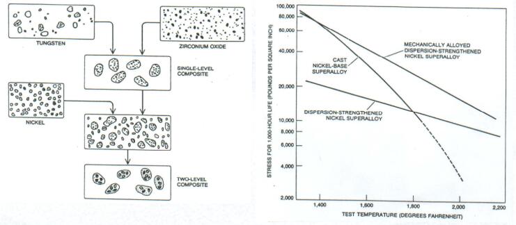 冶金學(xué)家們采用機(jī)械合金化可以制備多層金屬復(fù)合材料。例如,當(dāng)將鎢和氧化鋯機(jī)械合金化時(shí),在鎢中會(huì)生成氧化鋯的單層復(fù)合材料,在加工過程中,復(fù)合材料變得又硬又脆。在添加鎳粉之后,進(jìn)一步加工生成一種不尋常的兩級(jí)復(fù)合材料:分散在鎢中的氧化鋯。進(jìn)而分散在鎳中。氧化鋯和鎳之間幾乎沒有接觸,因?yàn)檠趸啽绘u覆蓋。以這種方式可制造更復(fù)雜的結(jié)構(gòu)。